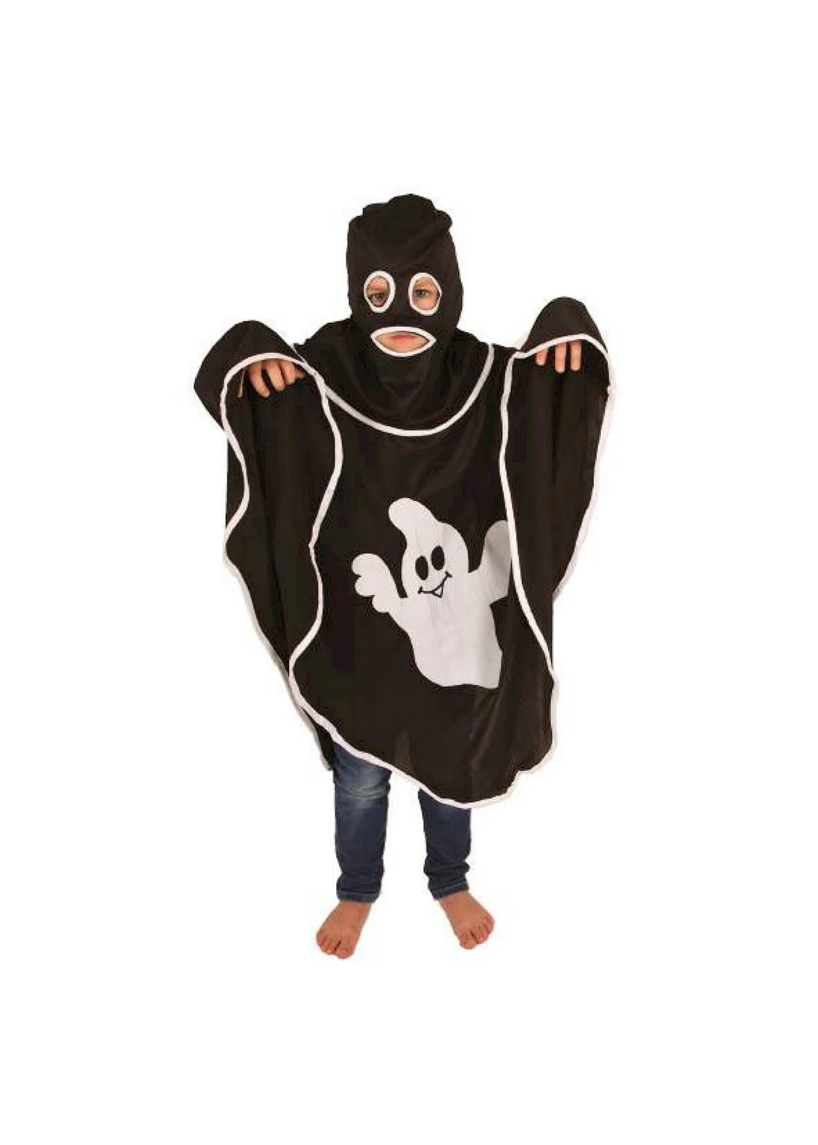 Zwarte cape met een spook er op zodat je lekker kan spoken met Halloween.