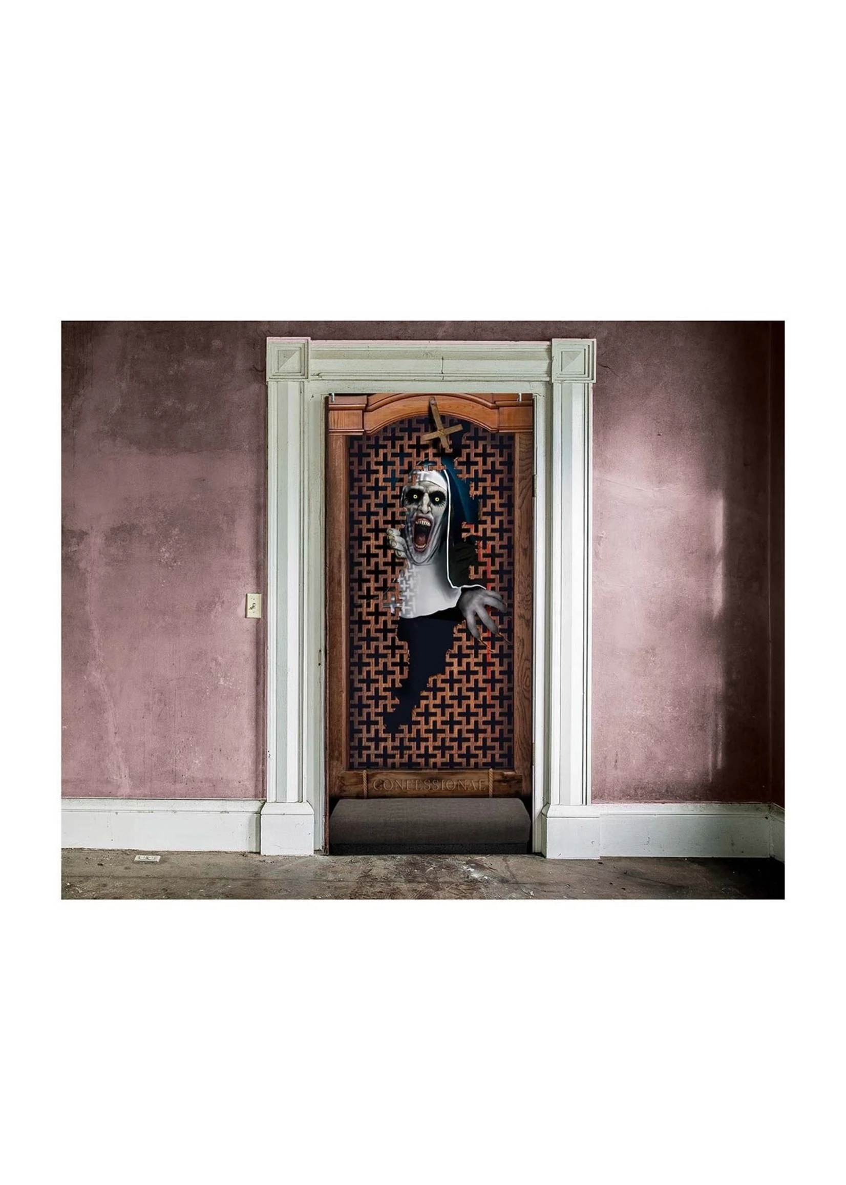 Deur decoratie met horror non om je Halloween feestje nog griezeliger te maken.