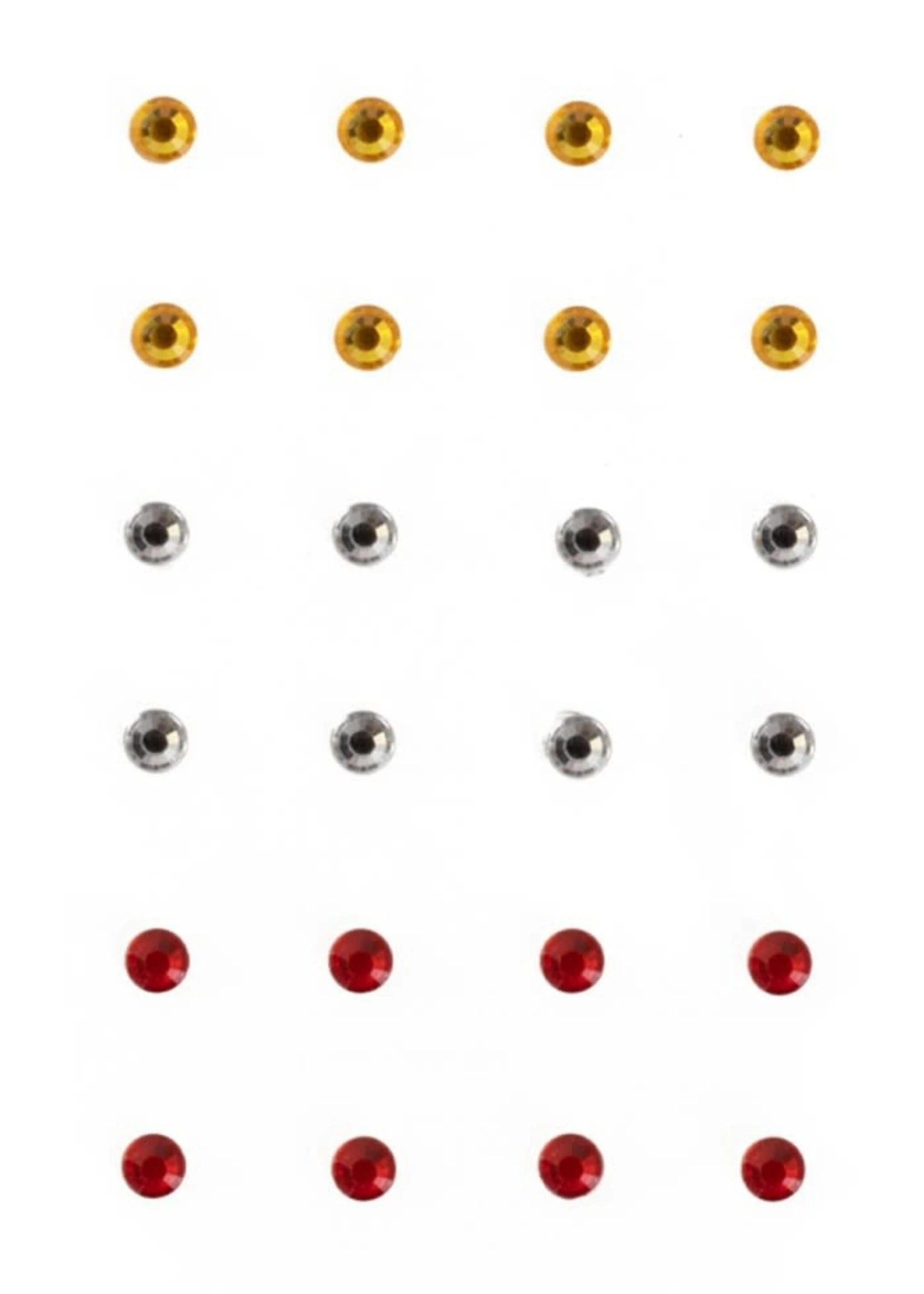 Lichaamsversiering in de vorm van gekleurde puntjes in het rood, geel en zilver .