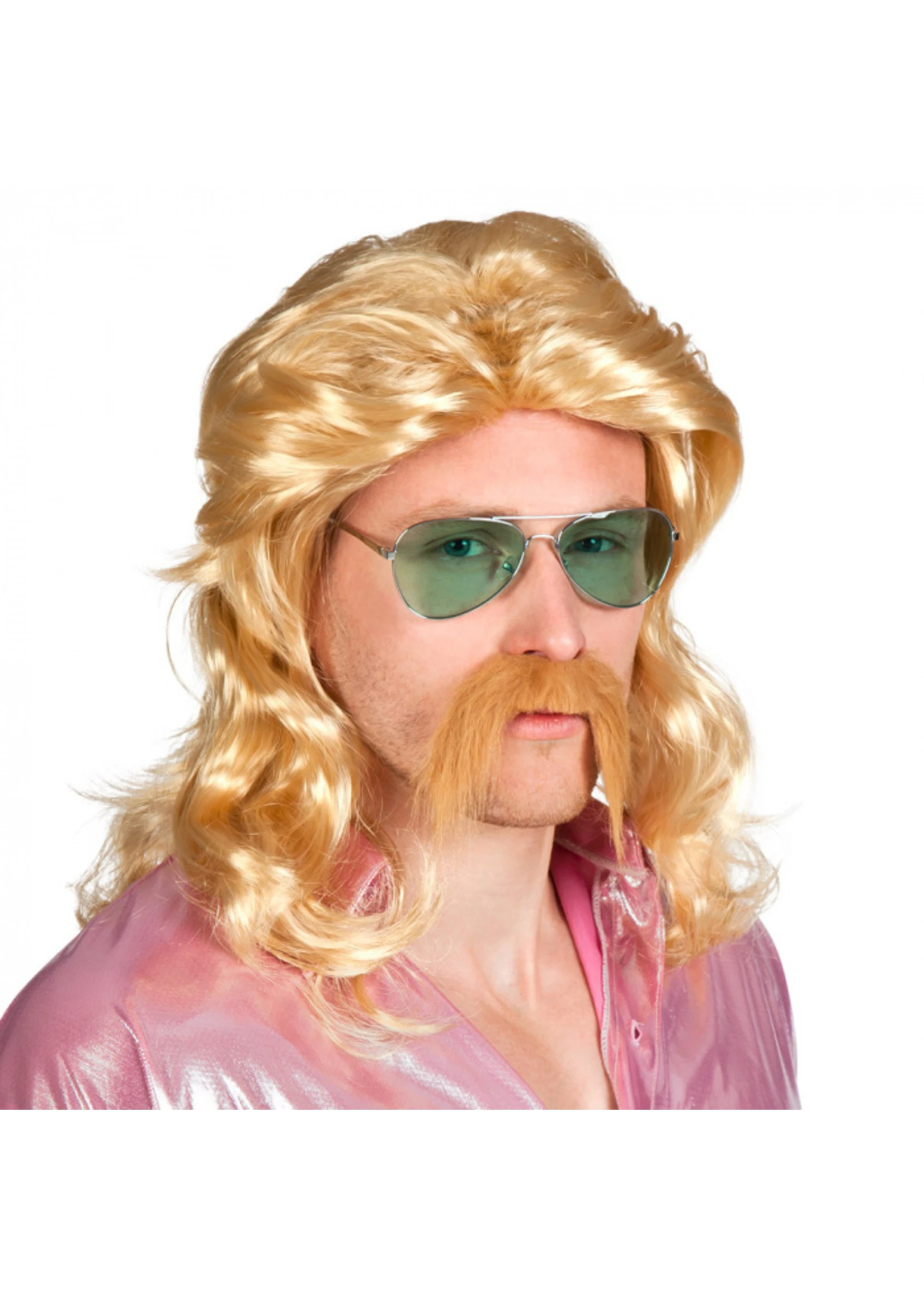 Leuke blonde heren pruik met halflang haar en een losse snor .