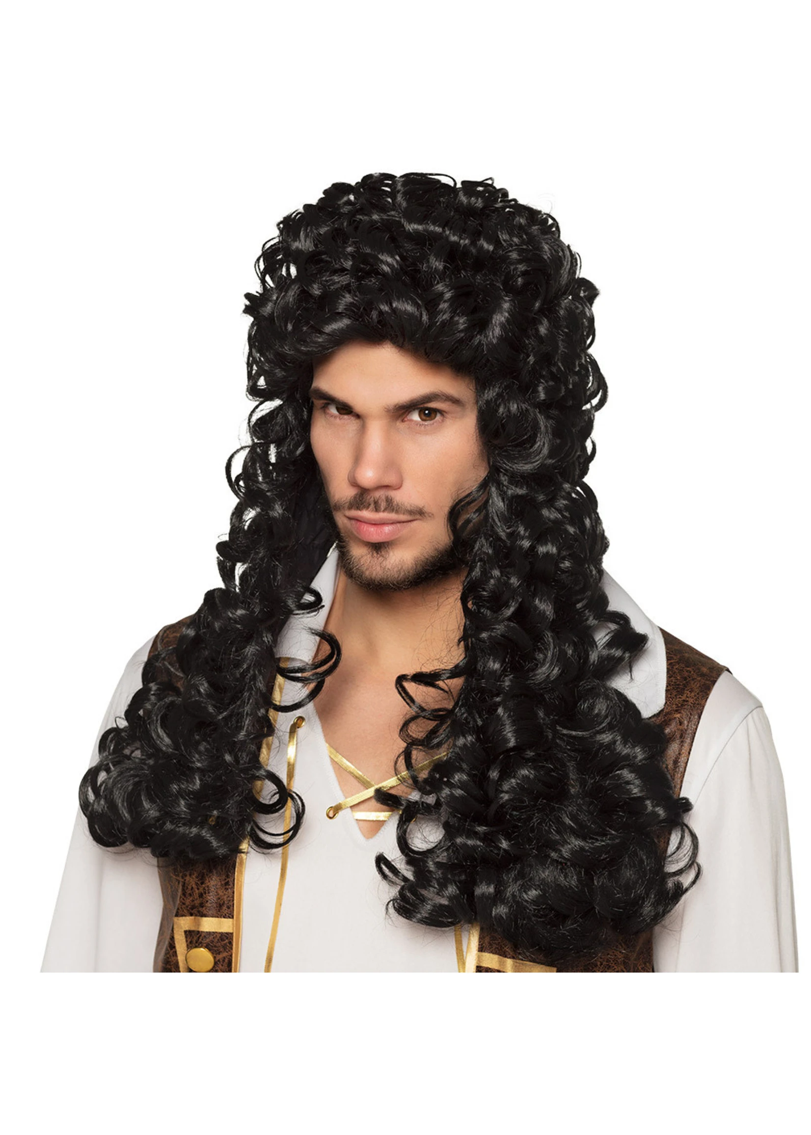 Pruik Piratenkapitein is een mooie pruik met lang zwart krullend haar voor de stoere piraat.