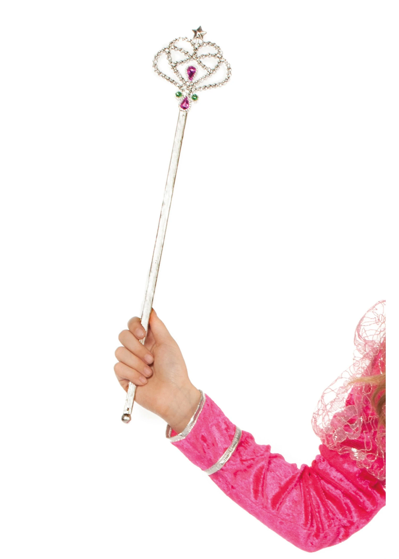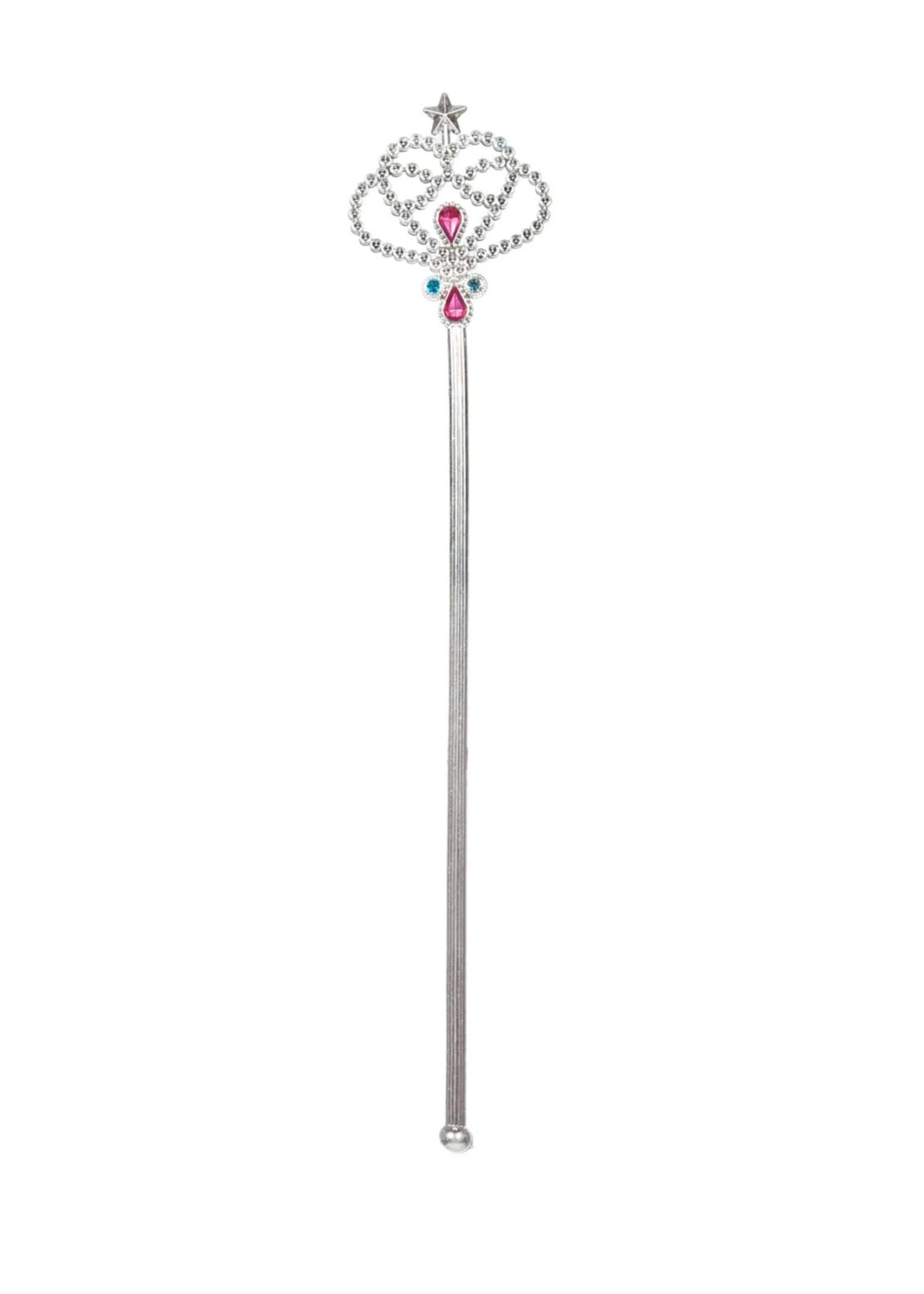 Het stafje is zilverkleurig, met gekleurde edelstenen en een sterretje in de top.
