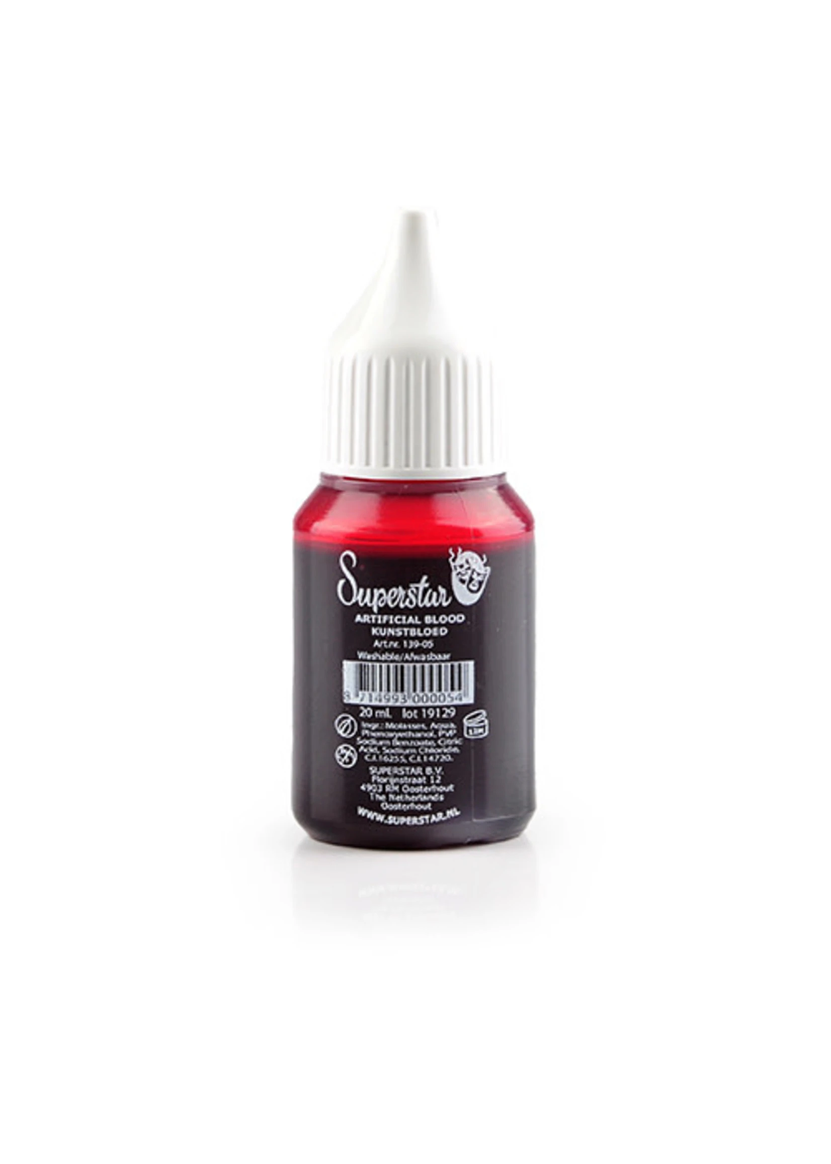 Dit flesje Superstar kunstbloed is helder, dik en stollend. Het is vrij dik en blijft mooi op de aangebrachte plek zonder uit te lopen. Het bloed stolt. Geschikt voor het maken van bloederige wonden.