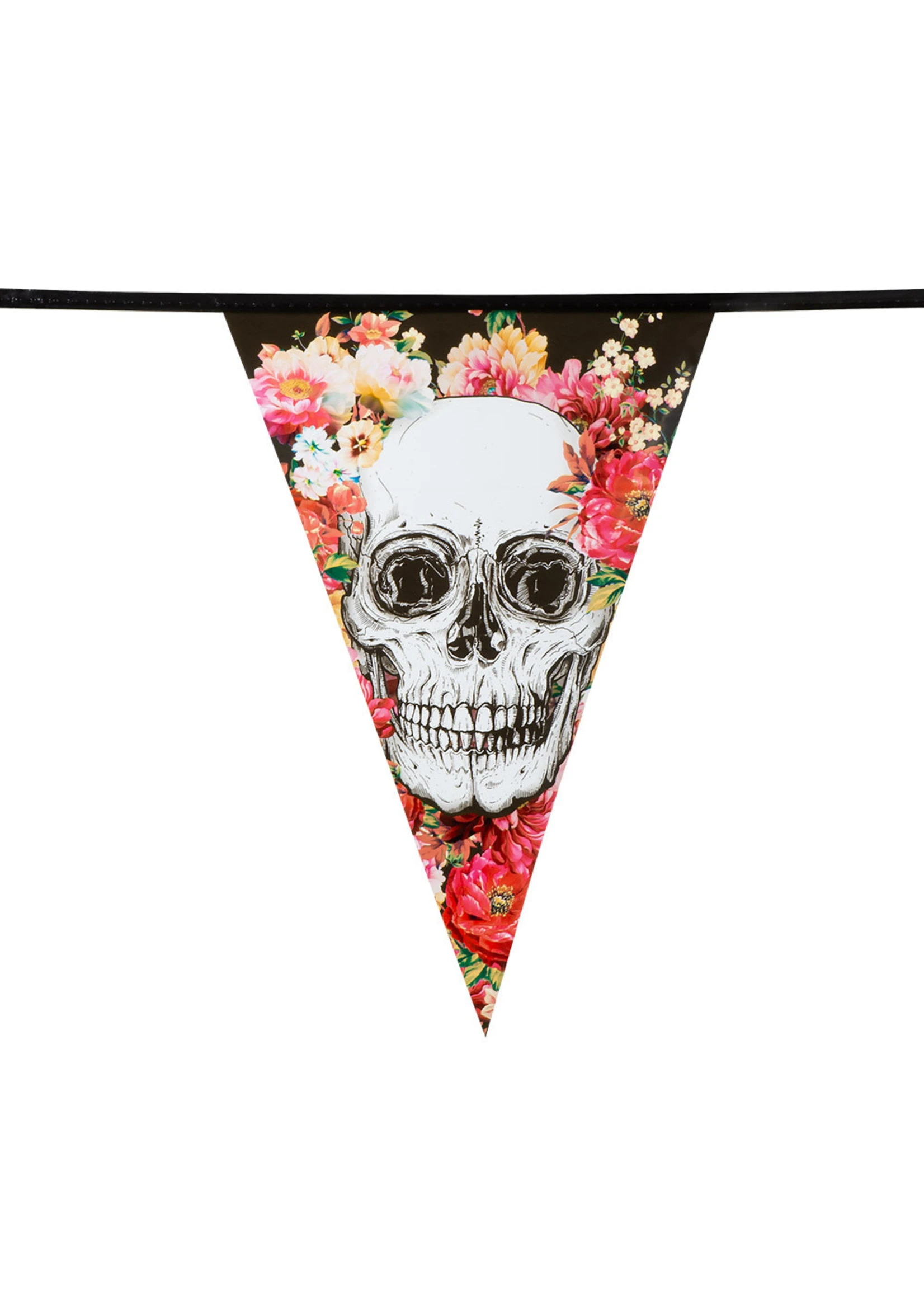 Halloween vlaggenlijn met PVC vlaggetjes met doodskoppen.