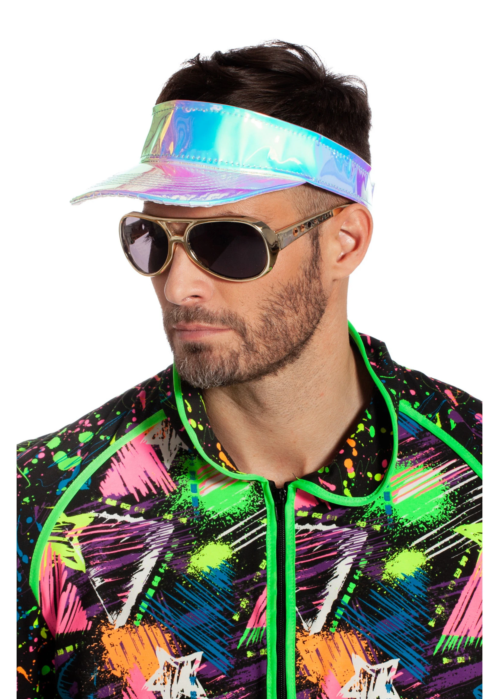 Metallic zilveren zonneklep Bling weerspiegelt alle kleuren van de regenboog. Met verstelbaar klittenband.